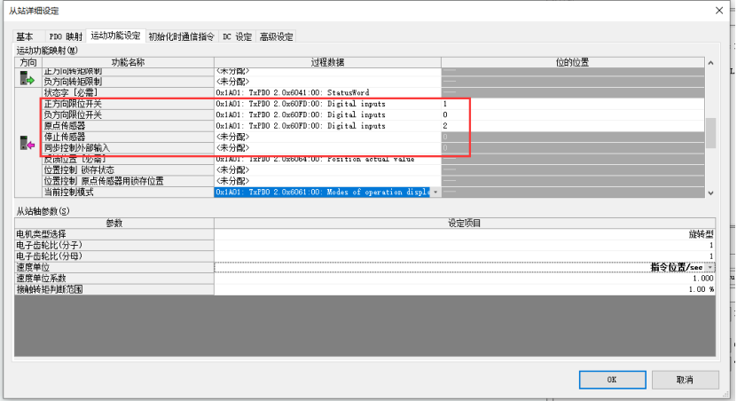 在運動功能設(shè)定界面下,找到限位開關(guān)映射,正方向限位開關(guān)映射修改為 60FD.1,負限