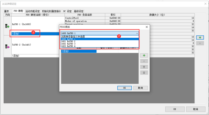 默認(rèn)的 RxPDO 1(0x1600),輸入映射選擇 TxPDO 1(0x1A00)即可。