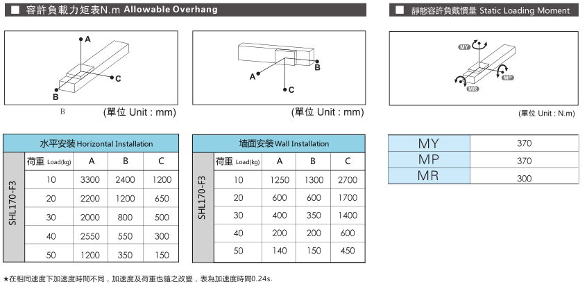 山社線性馬達(dá)模組容許負(fù)載力矩選型參數(shù):