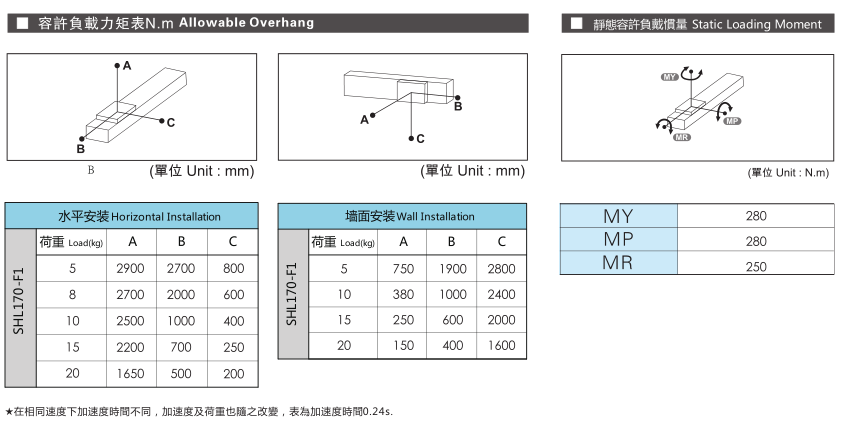 山社線性馬達(dá)模組容許負(fù)載力矩選型參數(shù):