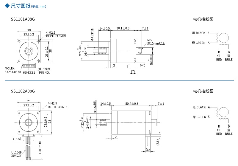 ■ 28mm系列通孔步進(jìn)電機(jī)尺寸圖及接線圖