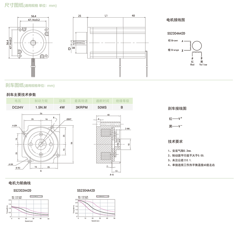 ■ 57mm系列剎車步進電機尺寸圖及接線圖