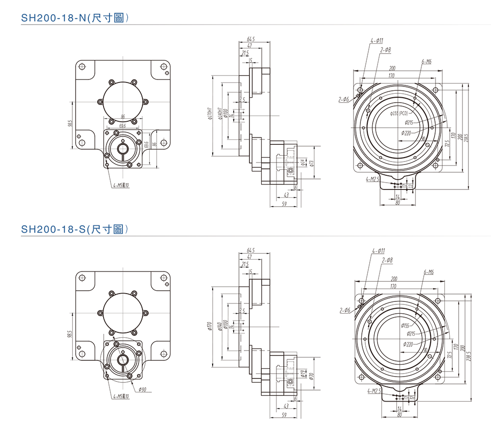 ■SH200-18-N/S中空旋轉(zhuǎn)平臺(tái)尺寸圖