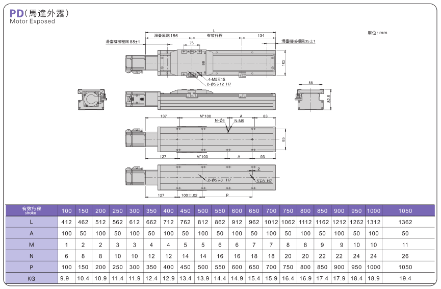 ■ 山社滑臺STH100系列螺桿樣式有效行程表
